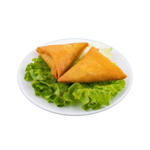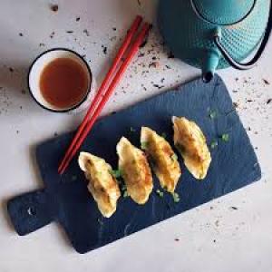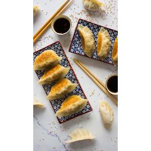 Pâte de gyoza frite, tartare de saumon, avocat, concombre, oignon rouge, sauce maison.