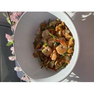 Nouilles jaunes au blé sautées crevette, carottes, ciboulette, œuf, choux chinois